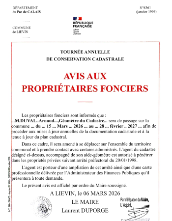 Le cadastre nous fait savoir que ses agents entament une tournée de vérification des propriétés à Liévin en vue d’actualiser les données dans le cadre de la mise à jour du plan cadastral. Les propriétaires fonciers sont informés que M Duval Arnaud, Géomètre du cadastre sera de passage sur la commune du 15 mars 2026 au 28 février 2027 afin de procéder à la mise à jour annuelles de la documentation cadastrale et la tenue à jour du plan cadastral.