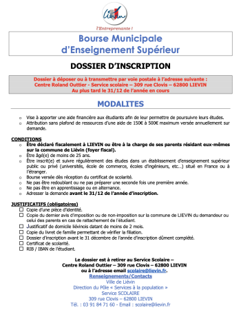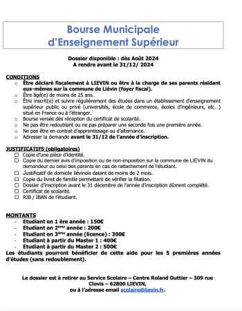 La Bourse étudiante est une aide financière attribuée aux étudiants de l'enseignement supérieur résidant à Liévin et scolarisés dans un établissement d'enseignement supérieur public ou privé reconnu par l'État.